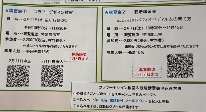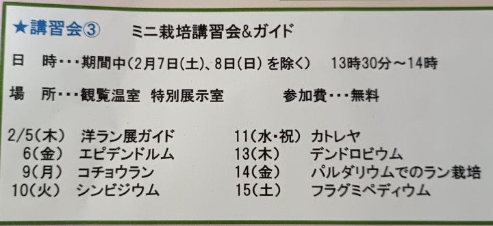 | ☆第34回冬洋ラン展 2026年2月5日(木)~14日(土) 京都府立植物園・観覧温室内にて ※京都洋ラン研究会の会員の作品展 ※講演会:遊川筑波実験植物園園長(2月8日13時30分から) ※洋ランと園芸資材の販売コーナー ※ワークショップ(パフィオの植え替え講習会) (2月7日13時30分から)教材費2000円、予約制 ※この他ほぼ毎日午後から洋ラン展ガイドや植え替え実演があります |